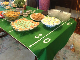 The weather, the food, the excuse to hang out all weekend...I just love it. Every year we go to at least one Clemson University game and one Cincinnati Bengals game. I have seen so many cute tablecloths on Pinterest that I had wanted to make one of my own for a while. When my sister told me she wanted a football themed bridal shower, I knew this was the time to do it. The idea of a football field tablecloth had been floating around in my head and now I had two excuses to make one -- for my tailgating parties and my sister's shower!